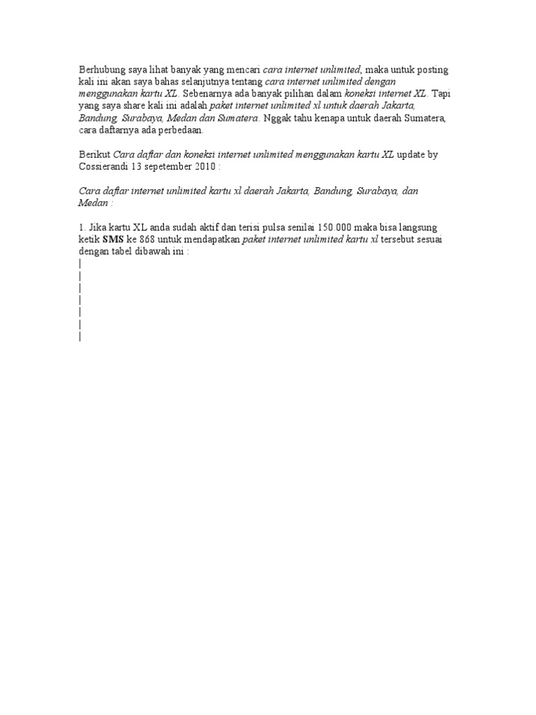 Cara Langganan Internet Xl Unlimited from imgv2-1-f.scribdassets.com Pelanggan lama xl bisa langsung daftar melalui myxl, sedangkan untuk yang baru dapat mengunjungi outlet retail agar mendapatkan penawarkan menarik. Cara beli paket nelpon xl unlimited via *123# Cara mendaftarnya sangat mudah, sahabat tinggal akses kode dial umb *123*11# menggunakan nomor xl sahabat. Lihat cara daftar dan tabel harga / tarif nelpon dibawah ini. Dengan berbagai kemungkinan yang terjadi, salah satu provider yaitu xl axiata berkomitmen bahwa jaringan yang dimilikinya bagus dan kecepatan akses internet yang memuaskan. Cara mendapatkan kuota gratis xl dan internet gratis xl terbaru 2021, trik kode rahasia internet seumur hidup di hp android akan kami coba ulas secara lengkap di sini. Silahkan akses *123# dari handphone atau pc/leptop anda (jika menggunakan modem). Paket internet xl unlimited facebook.